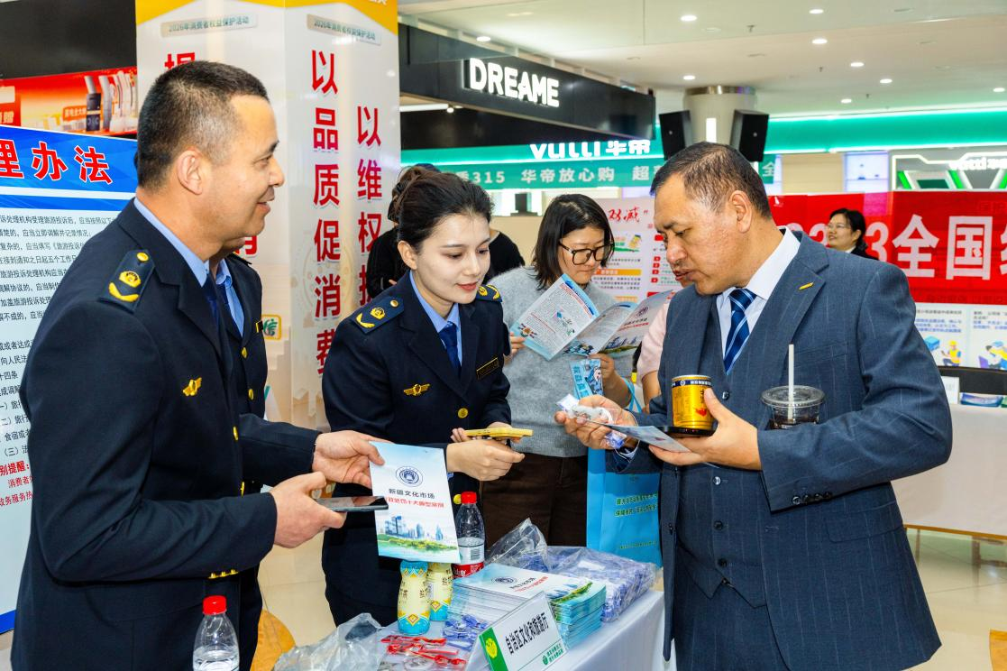 3月15日,在乌鲁木齐市华凌市场,执法队员向商户、群众讲解相关政策法规