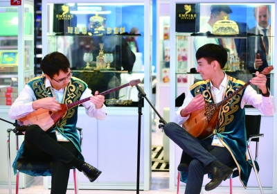 哈萨克斯坦馆内两位艺术家现场演奏哈萨克民族传统乐器冬不拉。