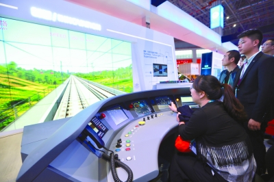 观众在中国馆内体验复兴号高铁模拟驾驶。