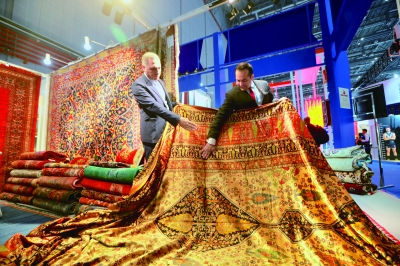 在文旅展区,伊朗工作人员展示有伊朗图案和中国传统图案的挂毯。