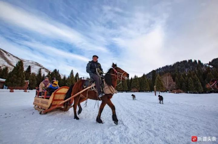 牧民们将马匹坐骑铺上了花毡,木制的爬犁脚下铺着地毯,乘坐这样的马拉爬犁漫游景区,微风迎面吹过,却不觉得冷,身边的美景如徐徐展开的画卷,一路前行半小时,一块开阔的河谷地带映入眼帘,靠河谷一侧半山腰上的山窝窝里有一户人家,那就是达人们要寻找的“冬窝子”。