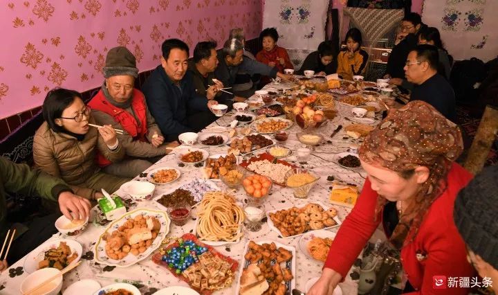 “冬窝子”外观简朴,前面是一排低矮的砖房,后面是圈舍和饲草垛。顺着一条“之”字形的羊肠小道,达人们爬上坡,推开牧民巴特西家的门,脱掉鞋子步入客厅。牧民巴特西一家已经准备了几十种民族风味的美食,包尔萨克、酸奶疙瘩、塔尔米、馓子、馕、野苹果酱、树莓酱、杏脯、糕点……达人们吃完餐前点心,羊肉串、马肉那仁又端上桌。开直播、录视频、摄影拍照……面对一道道新疆美食,达人们各种设备一起上,热闹非常。