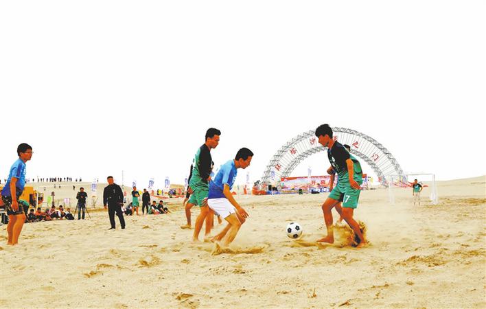 游客在景区体验沙漠足球娱乐项目(摄于6月1日)。 刘艳梅 摄
